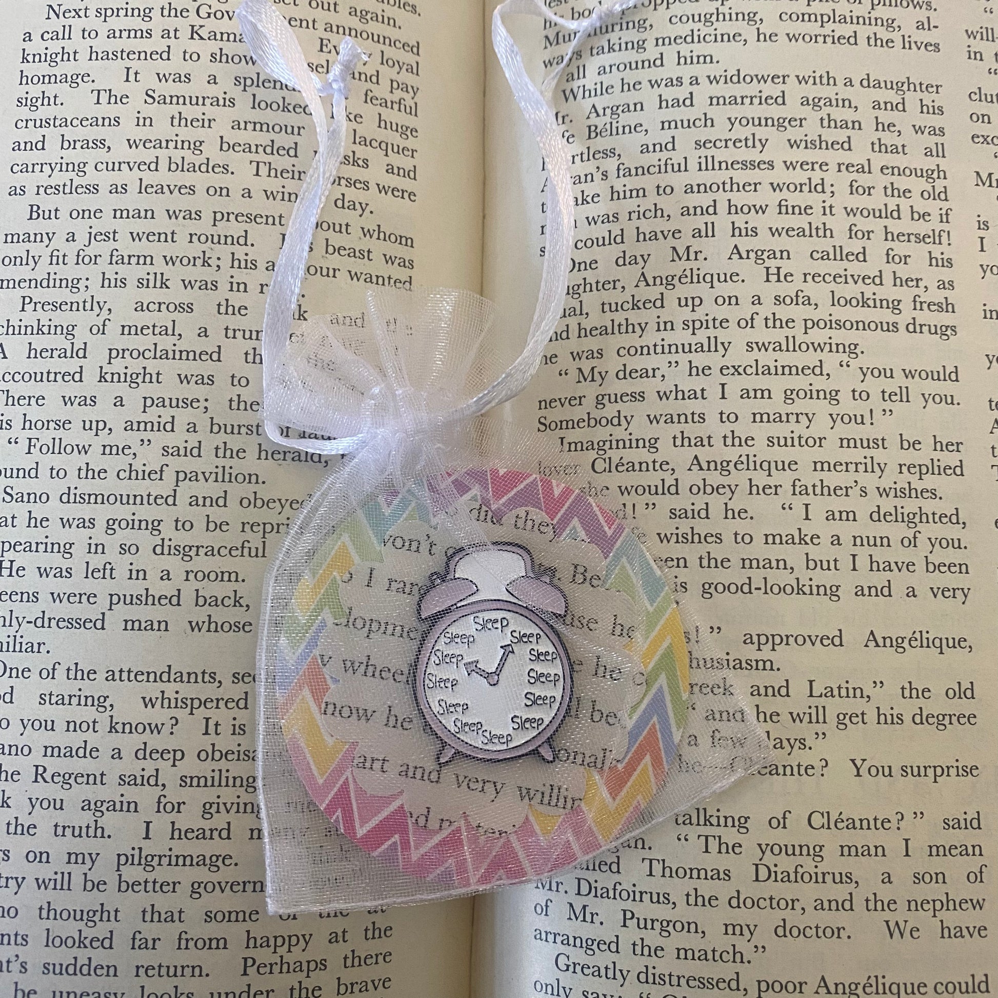 Item comes in an organza gift bag with a bookish backing card